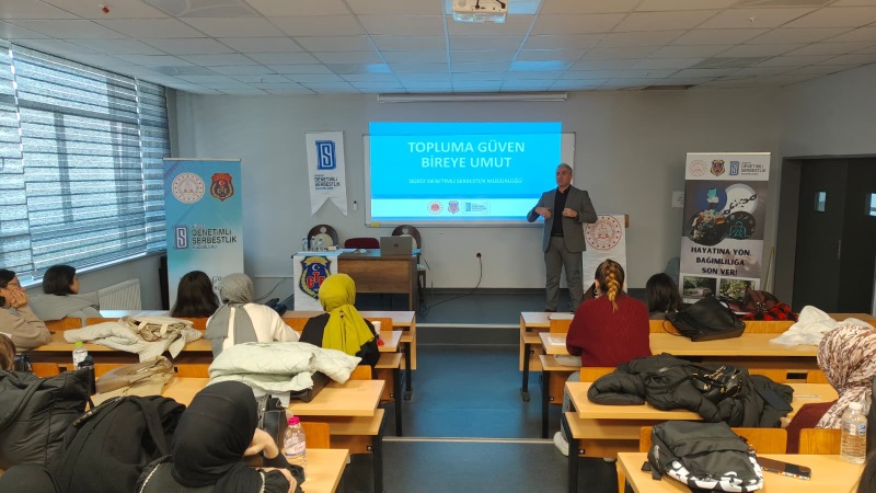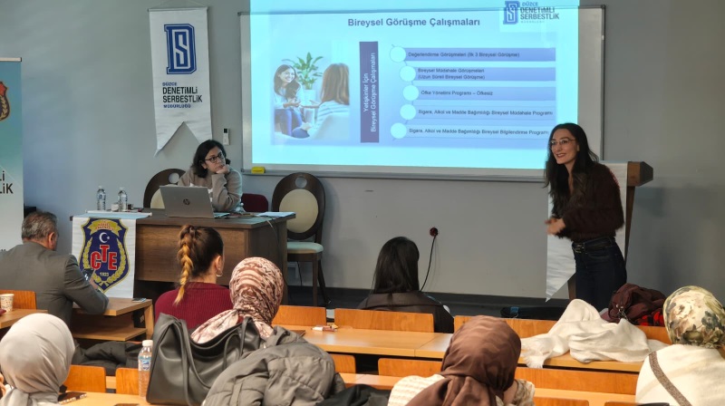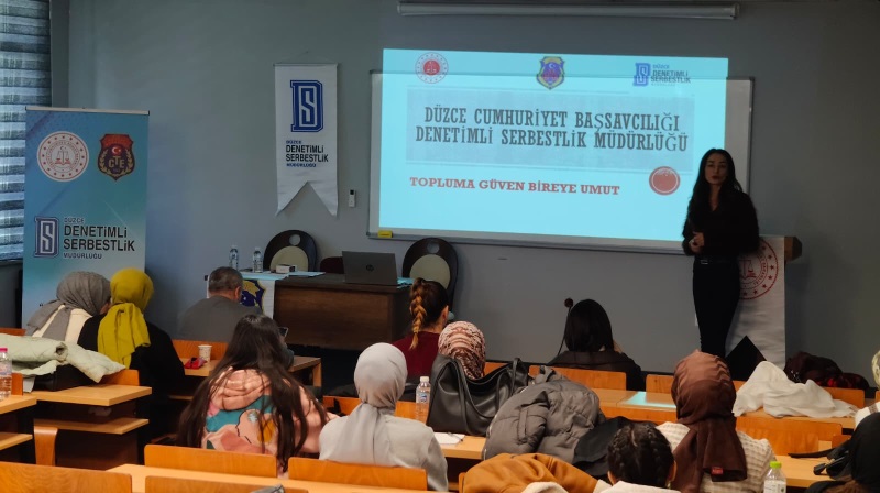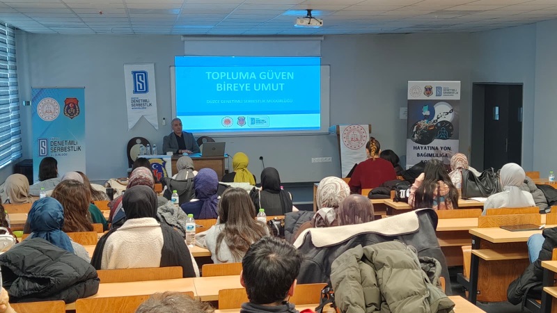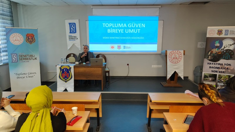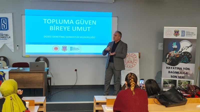 Denetimli Serbestlik Sisteminin 20. yılına özel farkındalık eğitimleri kapsamında; Müdürümüz Lütfullah ATEŞ ve Psikoloğumuz Esra YILMAZ tarafından Düzce Üniversitesi Sosyal Hizmetler Bölümü öğrencilerine, Denetimli Serbestliğin tanıtılması ve bağımlılık üzerine seminer verildi.