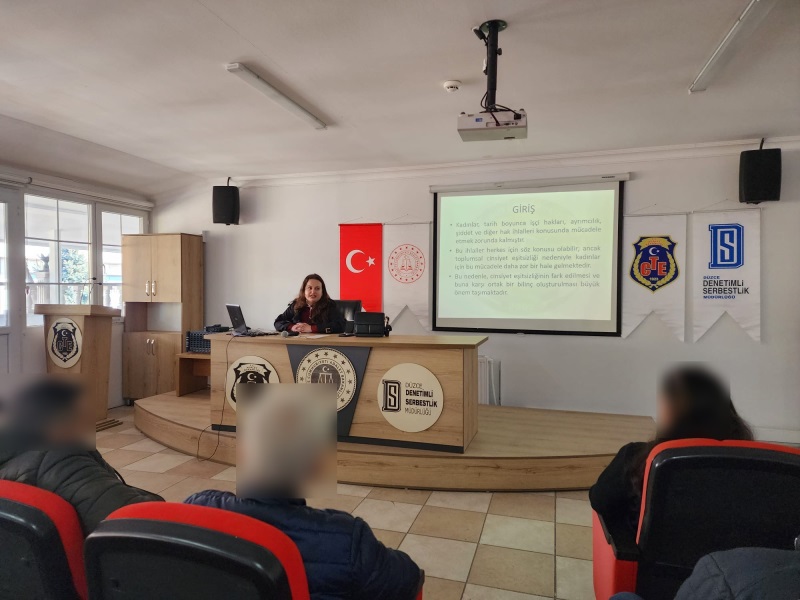 Düzce Barosu avukatlarından Hira Özdemir tarafından 8 Mart Dünya Kadınlar günü kapsamında farkındalık oluşturmak ve bilinçlendirmek amacıyla yükümlülerimize Kadın Hakları” konulu seminer verildi.